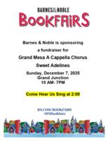 holiday concert. Barnes & Noble is sponsoring our fundraiser event on Sunday, December 7, 2025 from 10 am to 7 pm. There are so many wonderful gifts to choose for your friends and family! Chorus members will be present and will give you a special coupon/barcode to present to the cashier when you are ready to make your gift or personal purchases. A percentage of the sales made on December 7th will be donated to Grand Mesa A Cappella Chorus to assist us with our yearly expenses. Our FREE Holiday Concert will start at 2 pm. Hope you all can join us for this festive fundraiser!